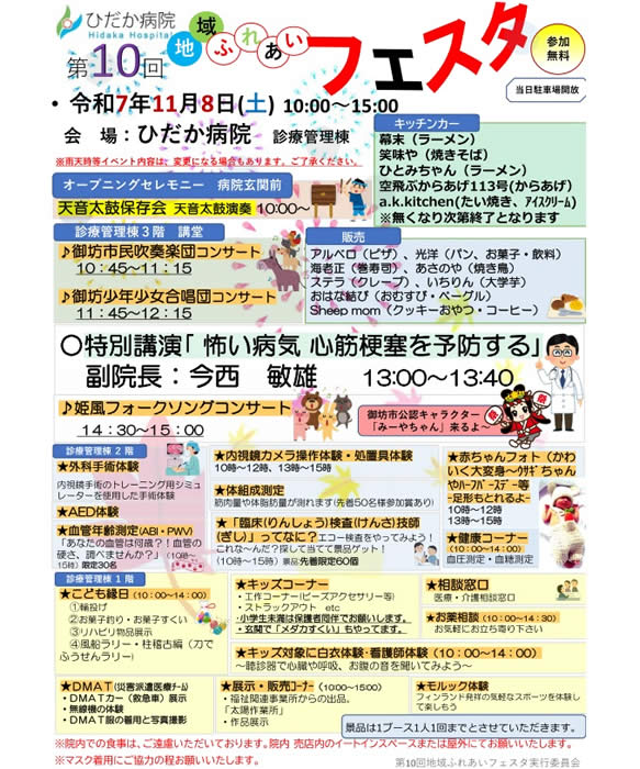 今年度、下記の日程で第10回地域ふれあいフェスタを開催するが決定しましたので、報告いたします。今年は多くの飲食店様の出店が決定しました。飲食店以外にも様々な世代が楽しめるイベントやブースも準備していますので、ご家族やご友人などお誘い合わせの上、お気軽にご来場ください。